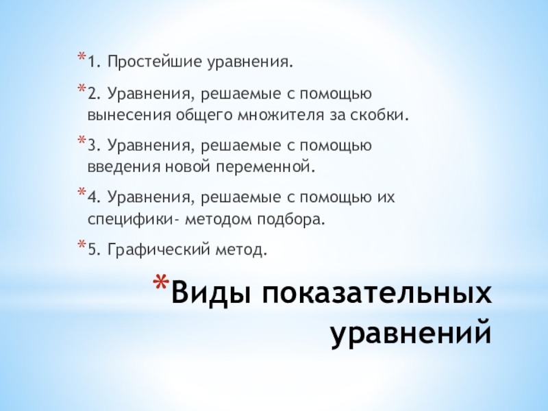 Виды показательных уравнений1. Простейшие уравнения.2. Уравнения, решаемые с помощью вынесения общего множителя за скобки.3. Уравнения, решаемые с