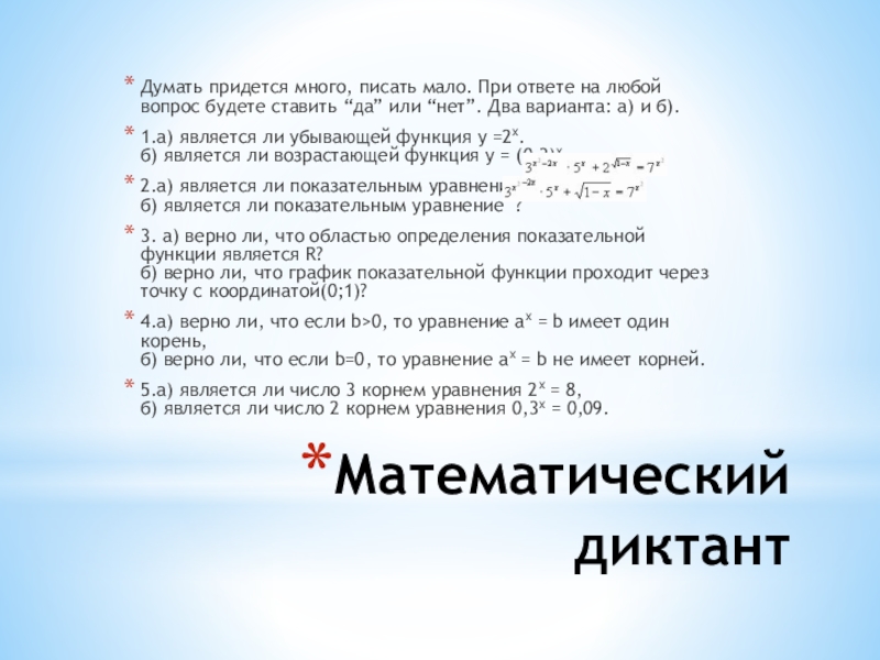 Математический диктантДумать придется много, писать мало. При ответе на любой вопрос будете ставить “да” или “нет”. Два