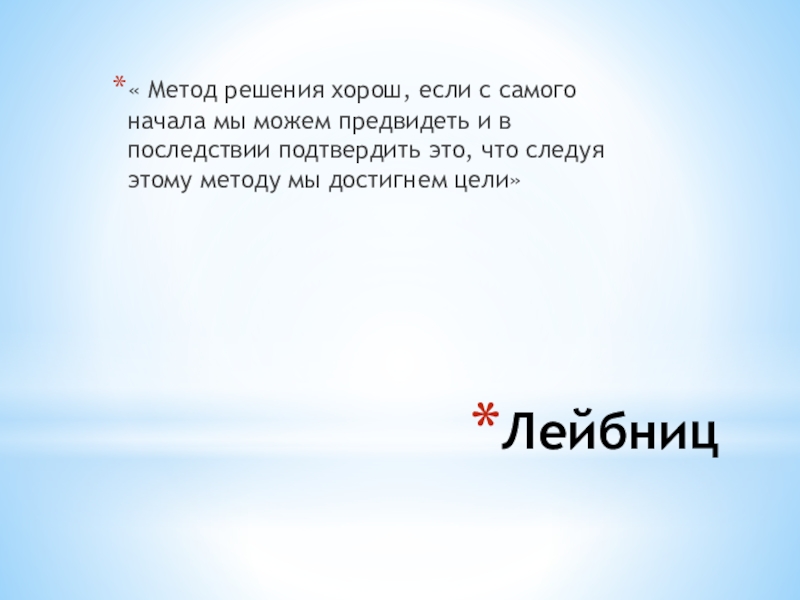 Лейбниц« Метод решения хорош, если с самого начала мы можем предвидеть и в последствии подтвердить это, что