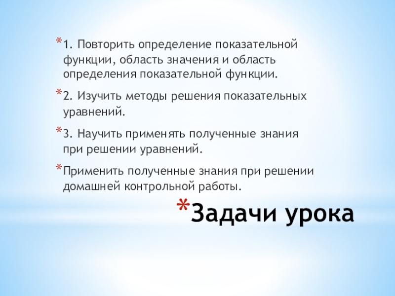 Задачи урока1. Повторить определение показательной функции, область значения и область определения показательной функции.2. Изучить методы решения показательных