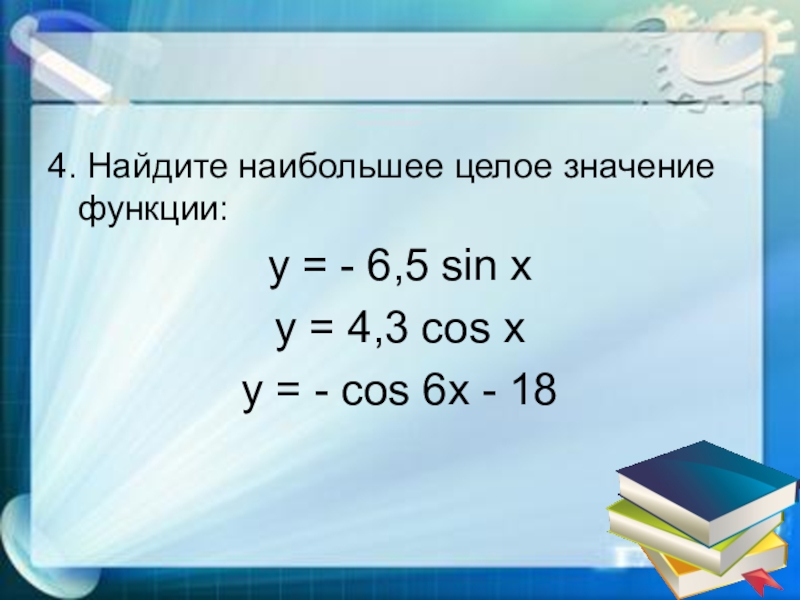 4. Найдите наибольшее целое значение функции:y = - 6,5 sin xy = 4,3 cos xy = -