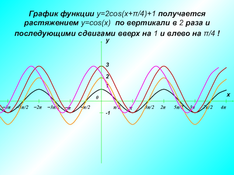 Слайд 11График функции y=2cos(x+π/4)+1 получается растяжением y=cos(x) по вертикали в 2 раза