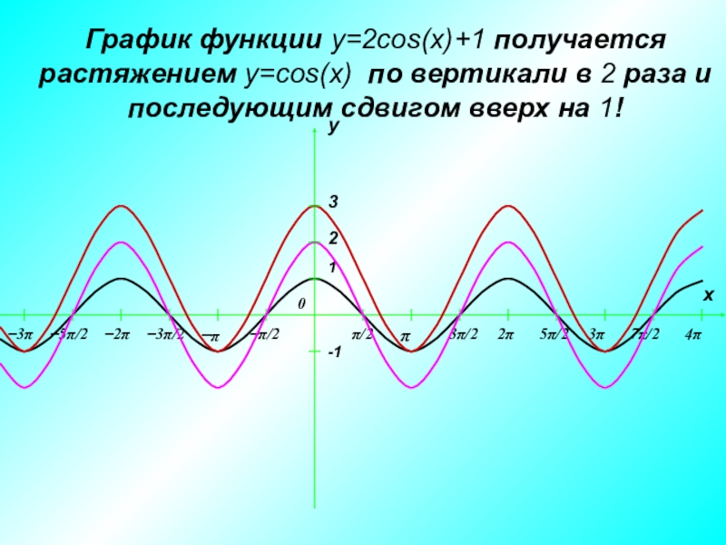 Слайд 9График функции y=2cos(x)+1 получается растяжением y=cos(x) по вертикали в 2 раза