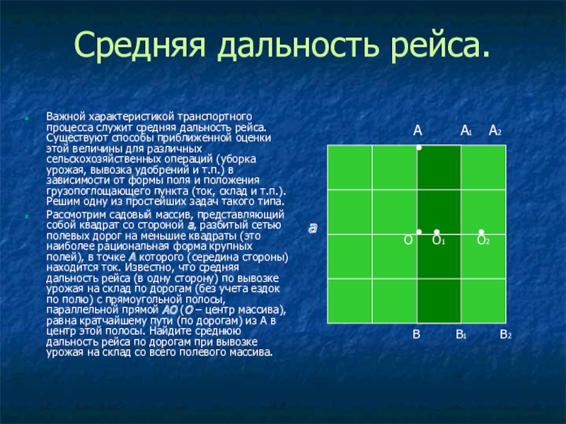 Рассмотрим садовый массив, представляющий собой квадрат со стороной а, разбитый сетью полевых дорог на меньшие квадраты (это наиболее рациональная форма крупных полей), в точке А которого (середина стороны) находится ток. Известно, что средняя дальность рейса (в одну сторону) по вывозке урожая на склад по дорогам (без учета ездок по полю) с прямоугольной полосы, параллельной прямой АО (О – центр массива), равна кратчайшему пути (по дорогам) из А в центр этой полосы. Найдите среднюю дальность рейса по дорогам при вывозке урожая на склад со всего полевого массива.