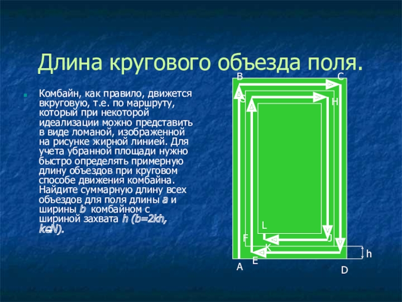способы приближенной оценки этой величины для различных сельскохозяйственных операций (уборка урожая, вывозка удобрений и т.п.) в зависимости от формы поля и положения грузопоглощающего пункта (ток, склад и т.п.). Решим одну из простейших задач такого типа.