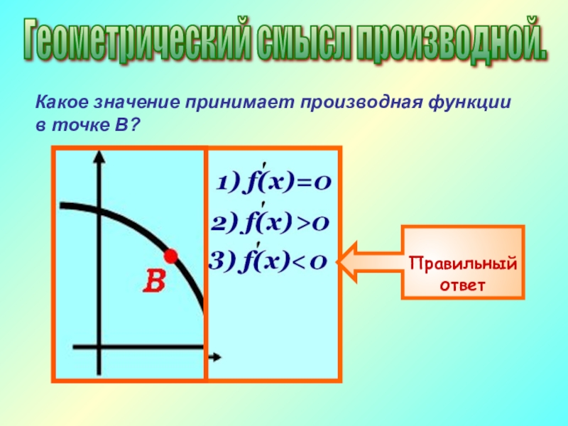 Геометрический смысл производной. ПравильныйответКакое значение принимает производная функции в точке В?