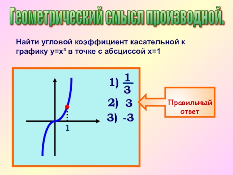 Геометрический смысл производной. ПравильныйответНайти угловой коэффициент касательной к графику у=х³ в точке с абсциссой х=1