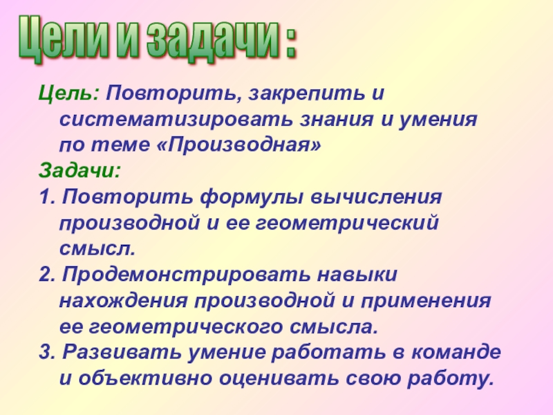 Цели и задачи :Цель: Повторить, закрепить и систематизировать знания и умения по теме «Производная»Задачи:1. Повторить формулы вычисления производной и ее геометрический смысл.2. Продемонстрировать навыки нахождения производной и применения ее геометрического смысла.3. Развивать умение работать в команде