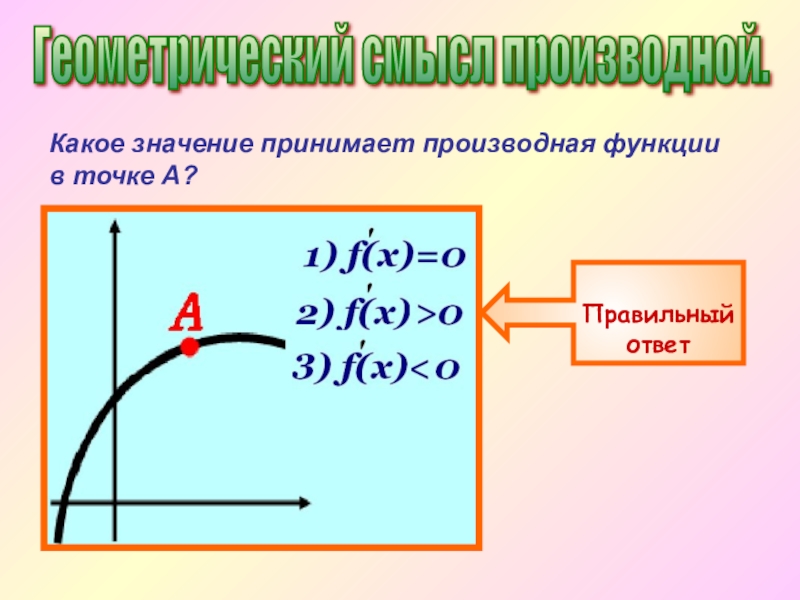 Геометрический смысл производной. ПравильныйответКакое значение принимает производная функции в точке А?
