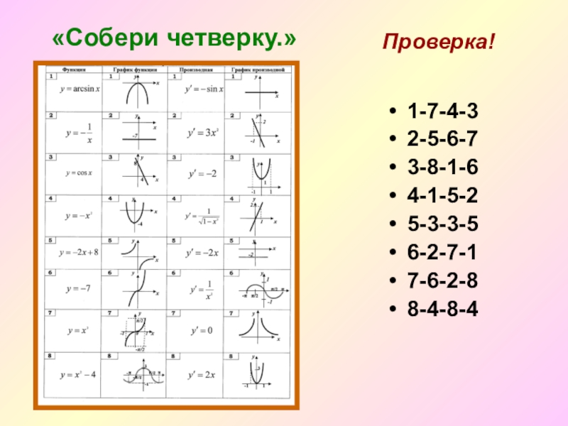 «Собери четверку.»1-7-4-32-5-6-73-8-1-64-1-5-25-3-3-56-2-7-17-6-2-88-4-8-4Проверка!