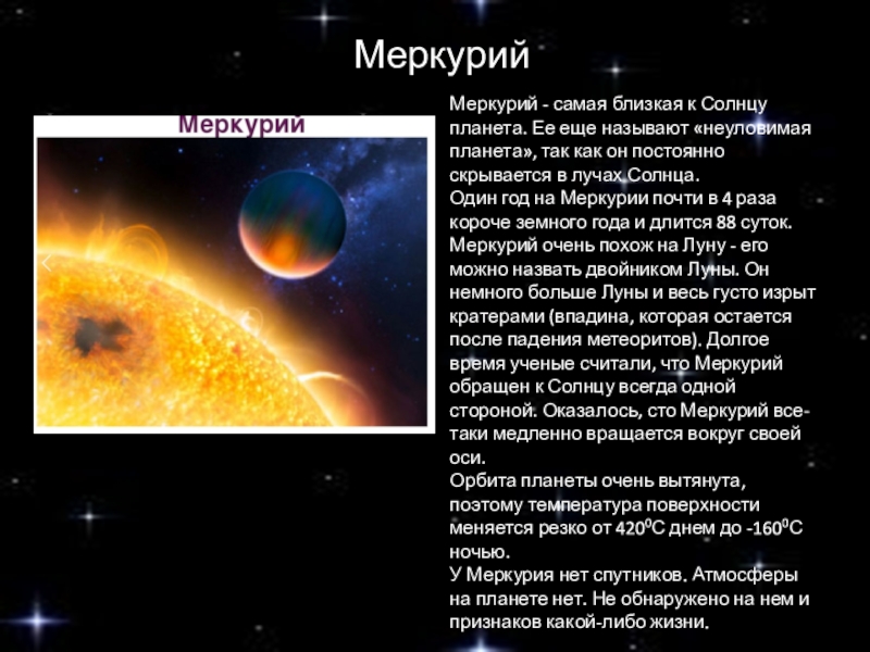 Меркурий - самая близкая к Солнцу планета. Ее еще называют