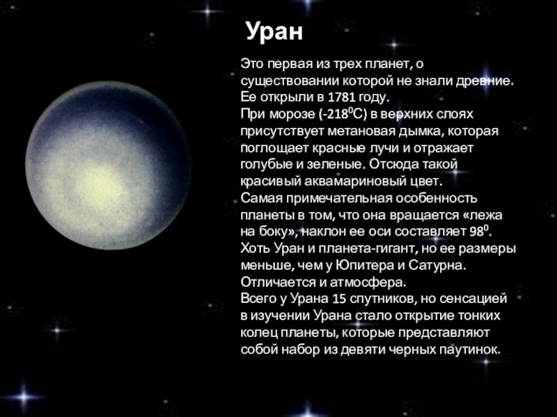 Самая примечательная особенность планеты в том, что она вращается «лежа на боку», наклон ее оси составляет 980.