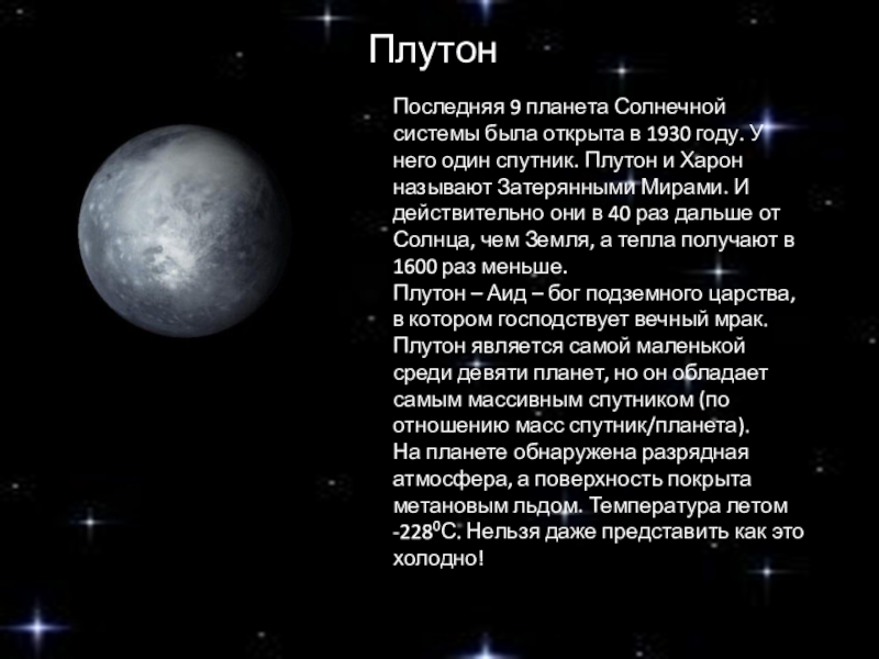 него один спутник. Плутон и Харон называют Затерянными Мирами. И действительно они в 40 раз дальше от Солнца, чем Земля, а тепла получают в 1600 раз меньше.