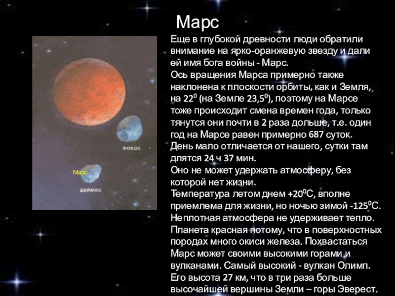 Температура летом днем +200С, вполне приемлема для жизни, но ночью зимой -1250С. Неплотная атмосфера не удерживает тепло. Планета красная потому, что в поверхностных породах много окиси железа. Похвастаться Марс может своими высокими горами и вулканами. Самый высокий - вулкан Олимп. Его высота 27 км, что в три раза больше высочайшей вершины Земли – горы Эверест.