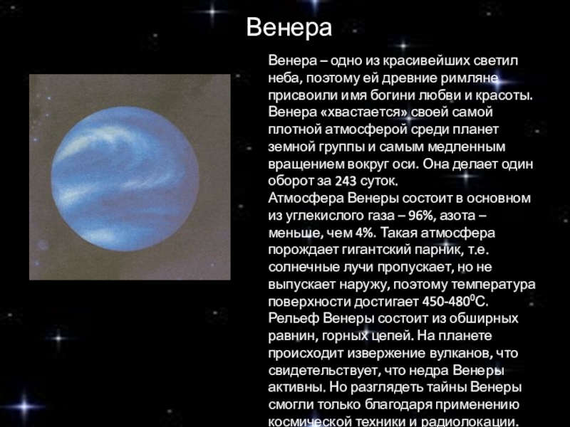 Атмосфера Венеры состоит в основном из углекислого газа – 96%, азота – меньше, чем 4%. Такая атмосфера порождает гигантский парник, т.е. солнечные лучи пропускает, но не выпускает наружу, поэтому температура поверхности достигает 450-4800С.