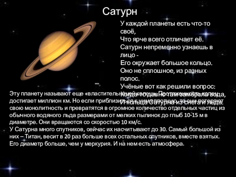У Сатурна много спутников, сейчас их насчитывают до 30. Самый большой из них – Титан, весит в 20 раз больше всех остальных спутников, вместе взятых. Его диаметр больше, чем у меркурия. И на нем есть атмосфера.