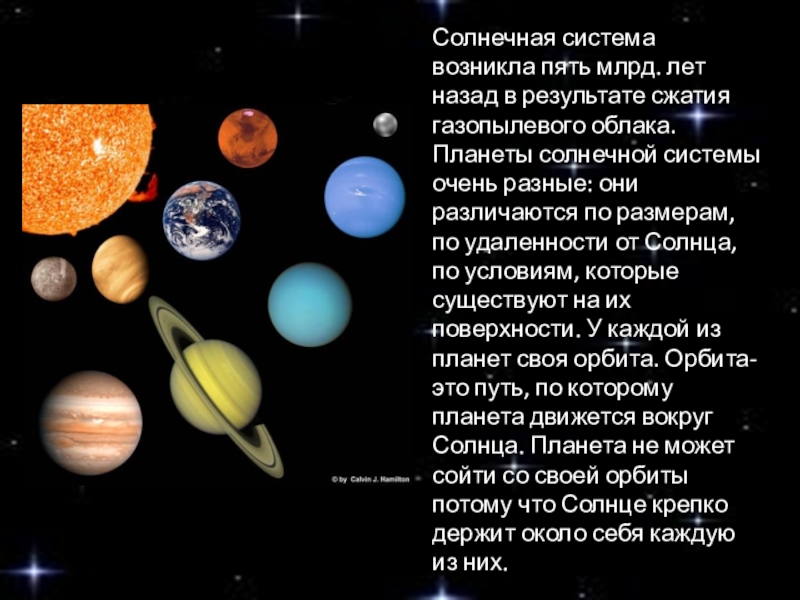Слайд 4Солнечная система возникла пять млрд. лет назад в результате сжатия газопылевого