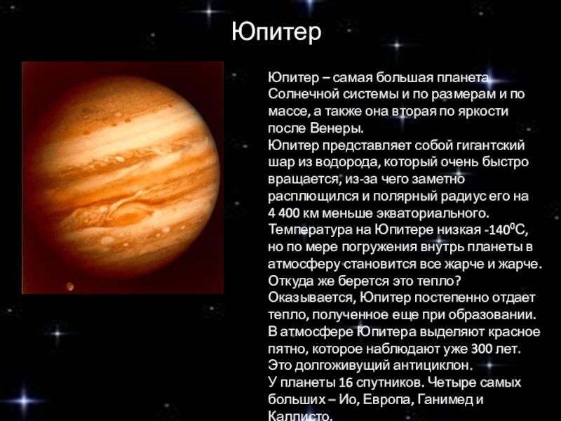 Юпитер представляет собой гигантский шар из водорода, который очень быстро вращается, из-за чего заметно расплющился и полярный радиус его на 4 400 км меньше экваториального.