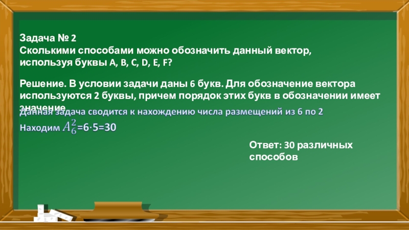 Решение. В условии задачи даны 6 букв. Для обозначение вектора используются 2 буквы, причем порядок этих букв в обозначении имеет значение