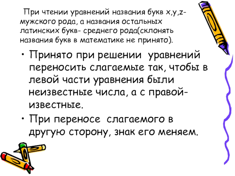 Принято при решении уравнений переносить слагаемые так, чтобы в левой части уравнения были неизвестные числа, а с правой- известные.