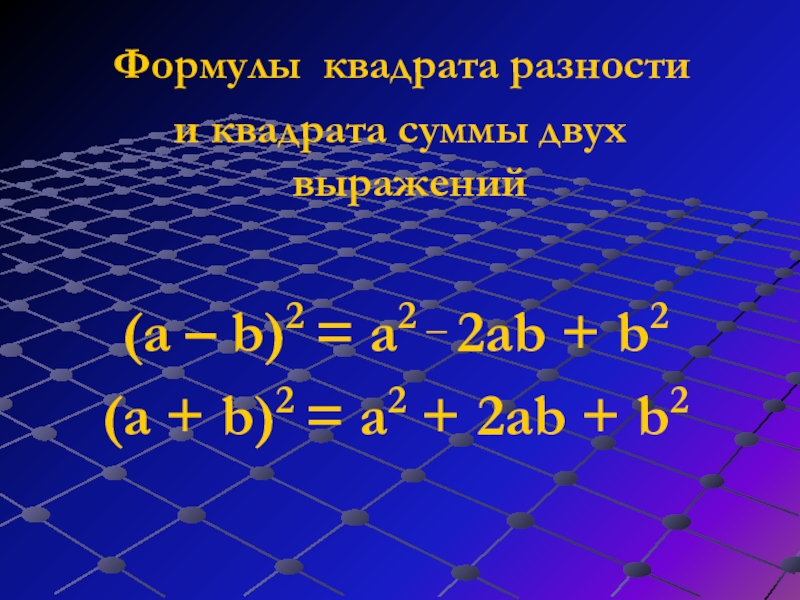 Формулы квадрата разности и квадрата суммы двух выражений (а – b)2 = а2 _ 2аb + b2 (а + b)2 = а2 + 2аb + b2