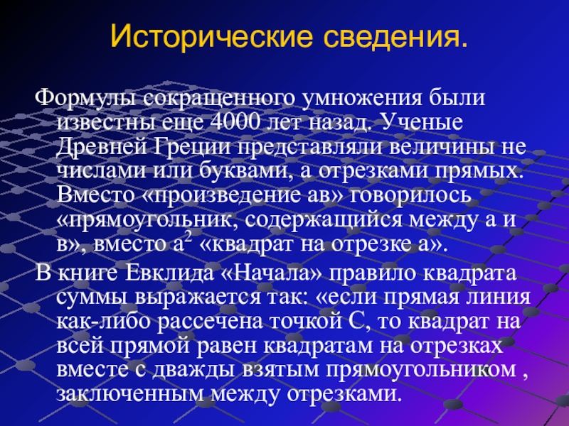 Исторические сведения. Формулы сокращенного умножения были известны еще 4000 лет назад. Ученые Древней Греции представляли величины не