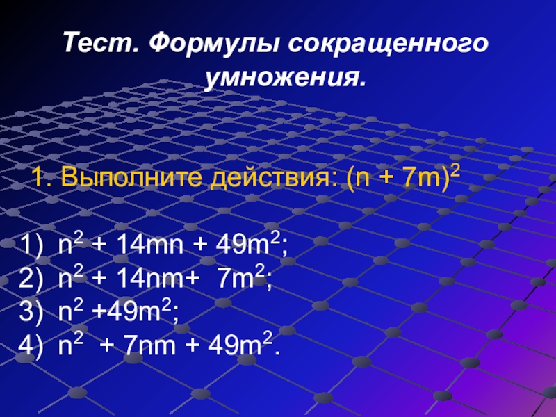 Тест. Формулы сокращенного умножения.1. Выполните действия: (n + 7m)2 n2 + 14mn + 49m2;     n2
