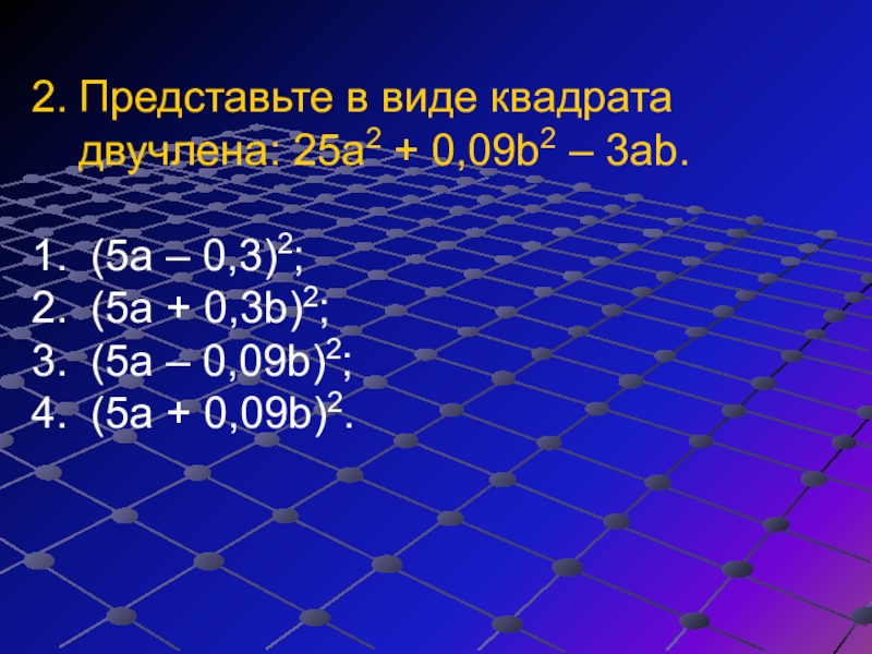 Слайд 6Представьте в виде квадрата двучлена: 25а2 + 0,09b2 – 3аb.