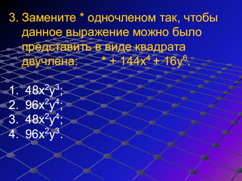 Слайд 7Замените * одночленом так, чтобы данное выражение можно было представить в