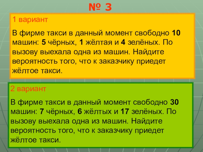 В фирме такси в данный момент свободно 30 машин: 7 чёрных, 6 жёлтых и 17 зелёных. По вызову выехала одна из машин. Найдите вероятность того, что к заказчику приедет жёлтое такси.