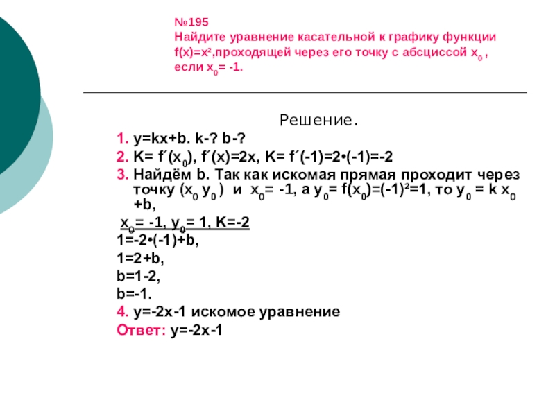 3. Найдём b. Так как искомая прямая проходит через точку (х0 y0 ) и х0= -1, а y0= f(x0)=(-1)²=1, то y0 = k х0 +b,