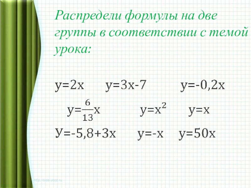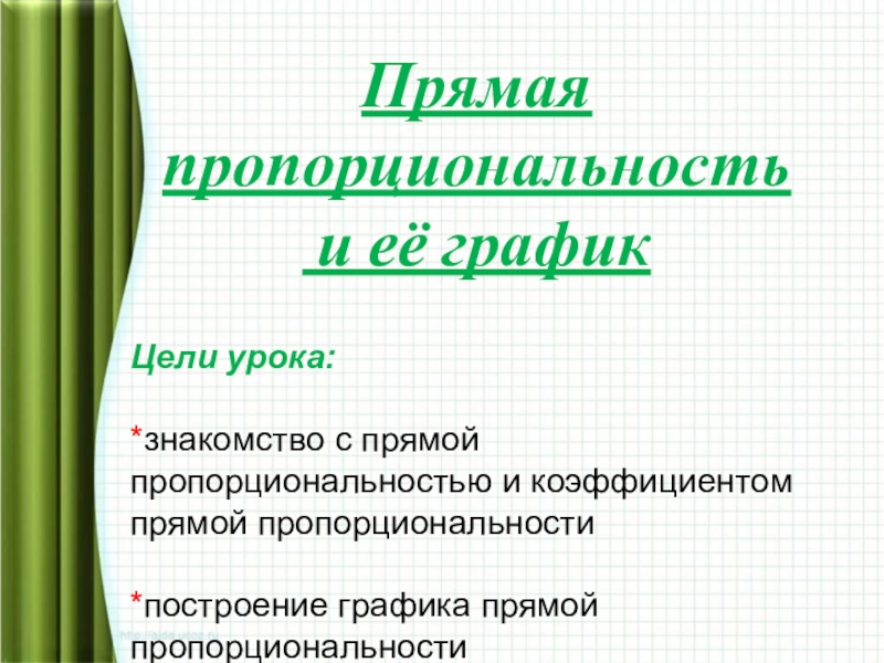 Прямая пропорциональность и её графикЦели урока:*знакомство с прямой пропорциональностью и коэффициентом прямой пропорциональности*построение графика прямой пропорциональности
