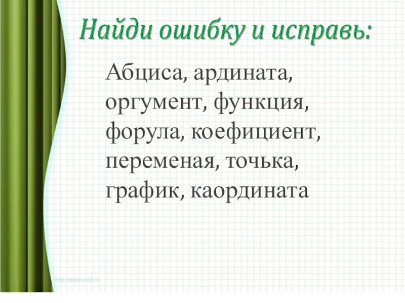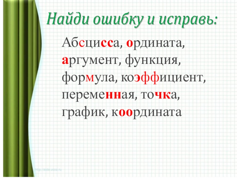 Абсцисса, ордината, аргумент, функция, формула, коэффициент, переменная, точка, график, координата