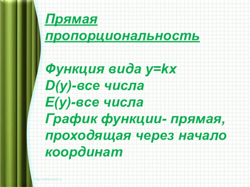 Прямая пропорциональностьФункция вида у=kхD(у)-все числаE(у)-все числаГрафик функции- прямая, проходящая через начало координат