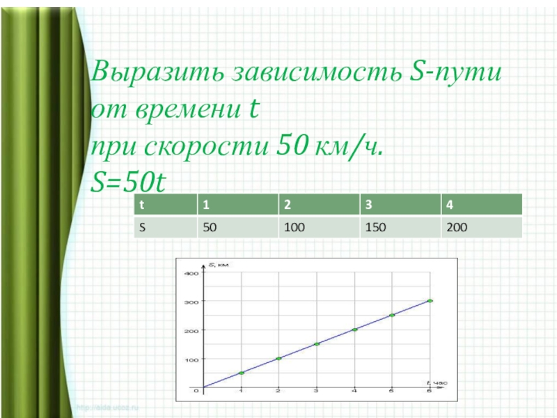 Выразить зависимость S-пути  от времени t при скорости 50 км/ч.  S=50t