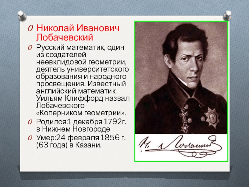 Русский математик, один из создателей неевклидовой геометрии, деятель университетского