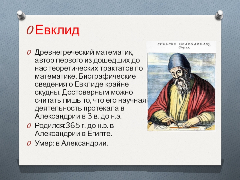 математике. Биографические сведения о Евклиде крайне скудны. Достоверным можно считать лишь то, что его научная деятельность протекала в Александрии в 3 в. до н.э.