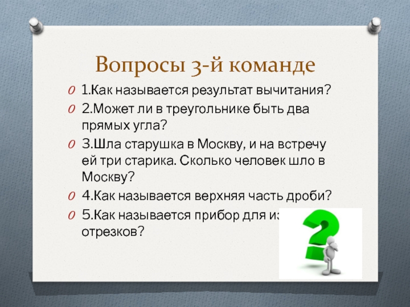 3.Шла старушка в Москву, и на встречу ей три старика. Сколько человек шло в Москву?