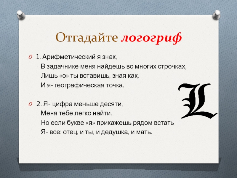 Логогриф- загадка. В ней надо сначала догадаться, о каком