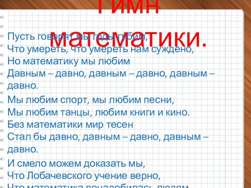 Гимн математики.Пусть говорят мы годы губим, Что умереть, что умереть нам суждено,