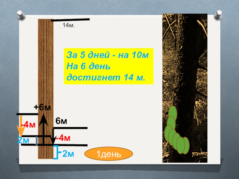 По дереву ползет гусеница. За день она поднимается на 6 м, а ночью опускается на 4 м. за сколько дней она доползет до вершины, если высота дерева 14м.