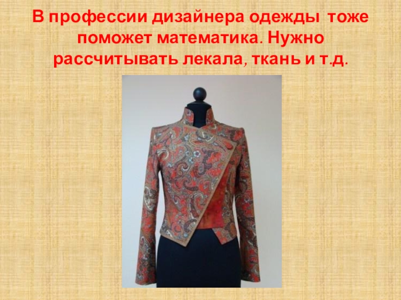 В профессии дизайнера одежды тоже поможет математика. Нужно рассчитывать лекала, ткань