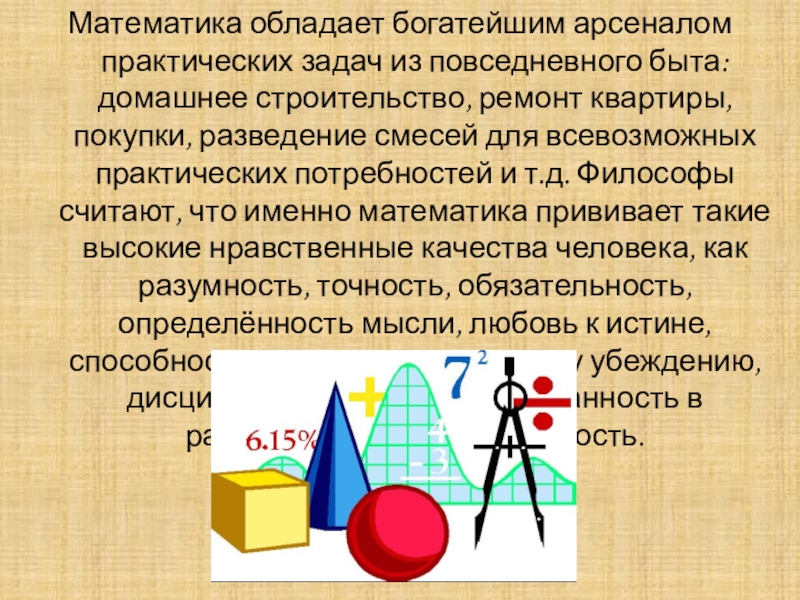 ремонт квартиры, покупки, разведение смесей для всевозможных практических потребностей и т.д. Философы считают, что именно математика прививает такие высокие нравственные качества человека, как разумность, точность, обязательность, определённость мысли, любовь к истине, способность к аргументированному убеждению, дисциплинированность и собранность в рассуждениях, внимательность.