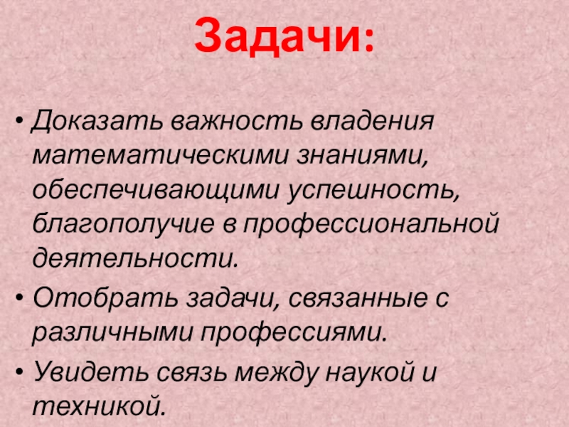 Доказать важность владения математическими знаниями, обеспечивающими успешность, благополучие в профессиональной деятельности.