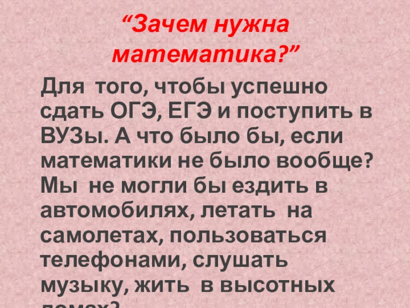 и поступить в ВУЗы. А что было бы, если математики не было вообще? Мы не могли бы ездить в автомобилях, летать на самолетах, пользоваться телефонами, слушать музыку, жить в высотных домах?