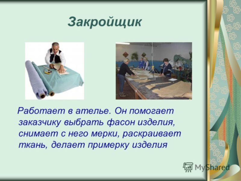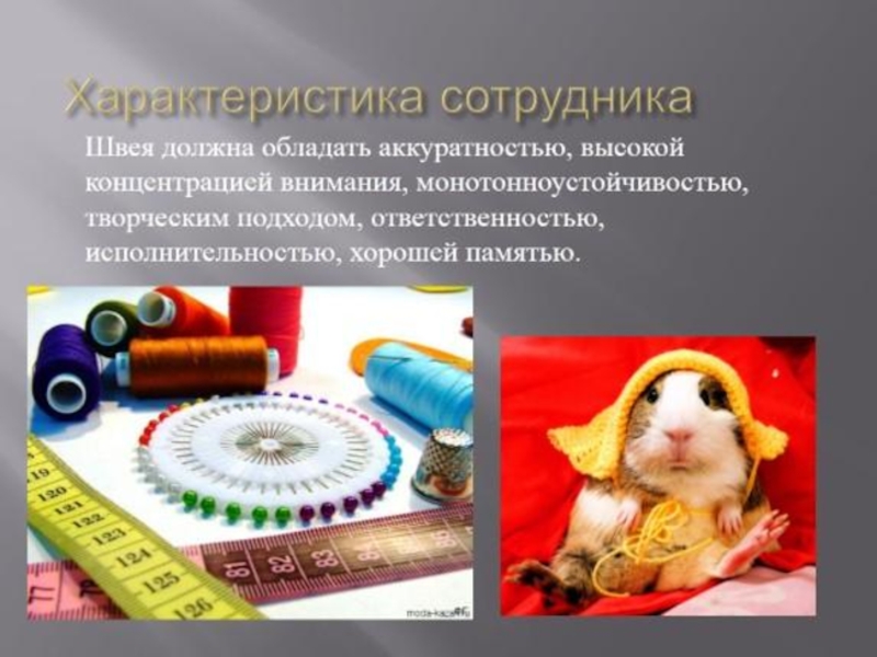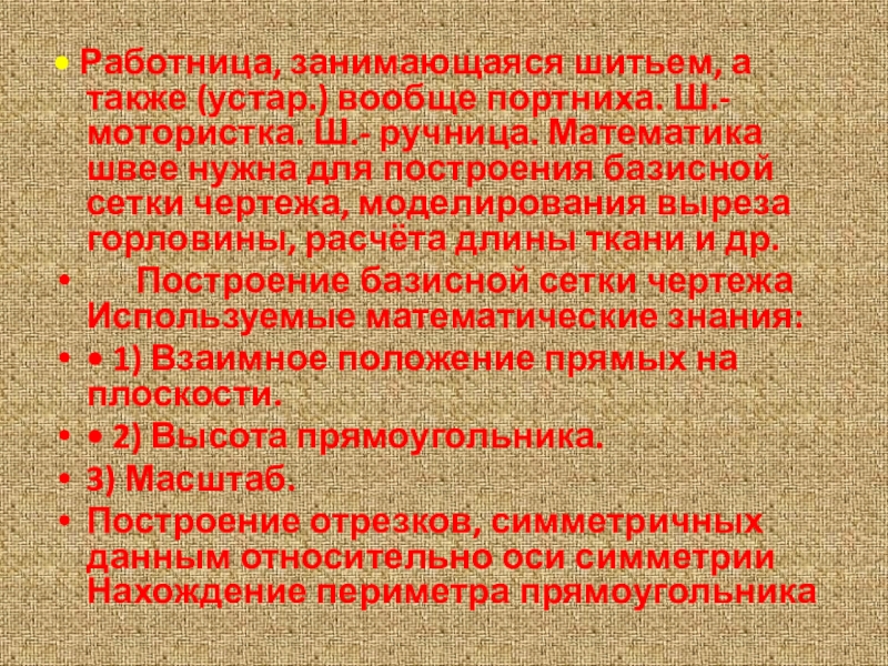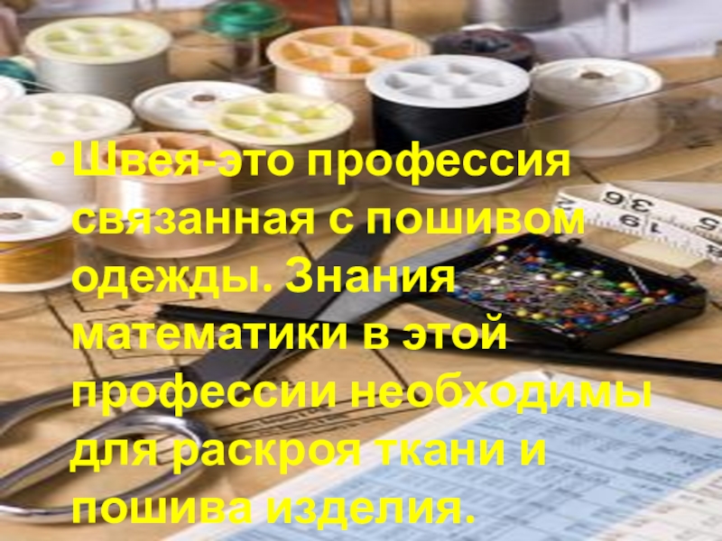 Слайд 11Швея-это профессия связанная с пошивом одежды. Знания математики в этой профессии