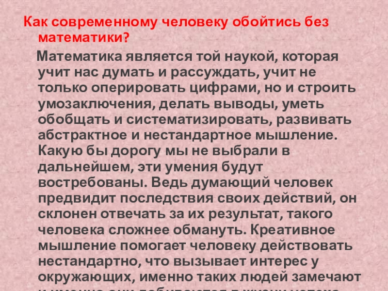 которая учит нас думать и рассуждать, учит не только оперировать цифрами, но и строить умозаключения, делать выводы, уметь обобщать и систематизировать, развивать абстрактное и нестандартное мышление. Какую бы дорогу мы не выбрали в дальнейшем, эти умения будут востребованы. Ведь думающий человек предвидит последствия своих действий, он склонен отвечать за их результат, такого человека сложнее обмануть. Креативное мышление помогает человеку действовать нестандартно, что вызывает интерес у окружающих, именно таких людей замечают и именно они добиваются в жизни успеха.