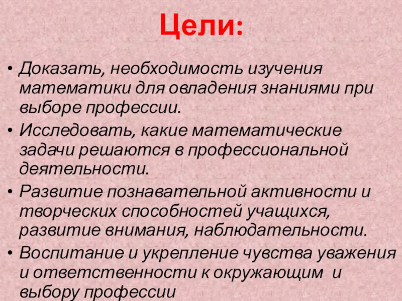 Доказать, необходимость изучения математики для овладения знаниями при выборе профессии.