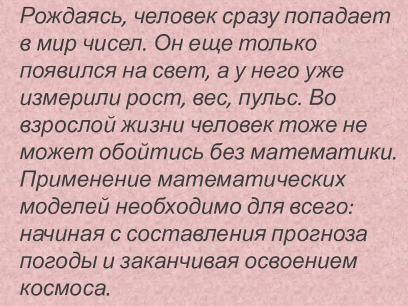 только появился на свет, а у него уже измерили рост, вес, пульс. Во взрослой жизни человек тоже не может обойтись без математики. Применение математических моделей необходимо для всего: начиная с составления прогноза погоды и заканчивая освоением космоса.