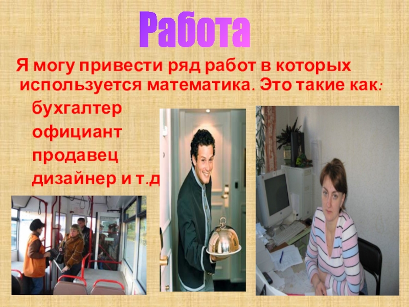 Слайд 21 Я могу привести ряд работ в которых используется математика.